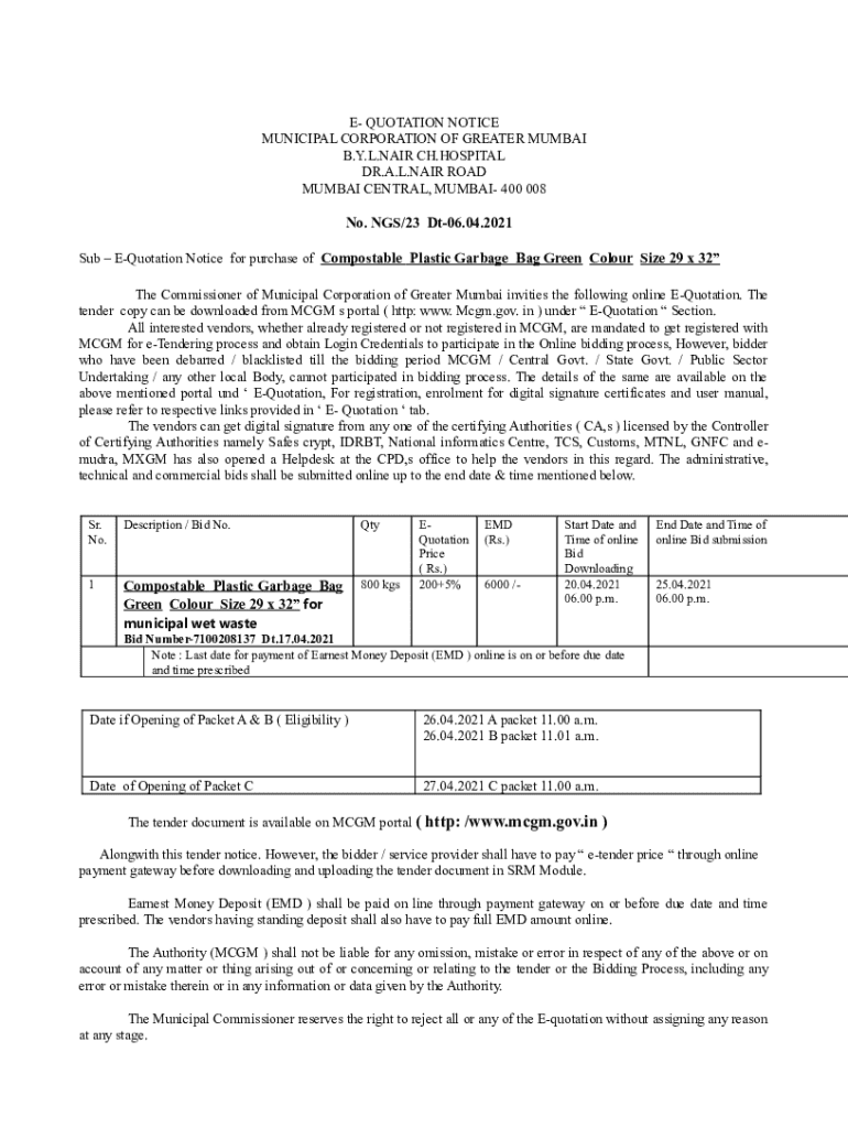 E QUOTATION NOTICE MUNICIPAL CORPORATION OF GREATER MUMBAI B.Y.L.NAIR CH.HOSPITAL DR. A.L.NAIR ROAD MUMBAI CENTRAL, MUMBAI 400 008No. NGS/23 Dt06.04.2021 Sub Quotation Notice for purchase of Compostable