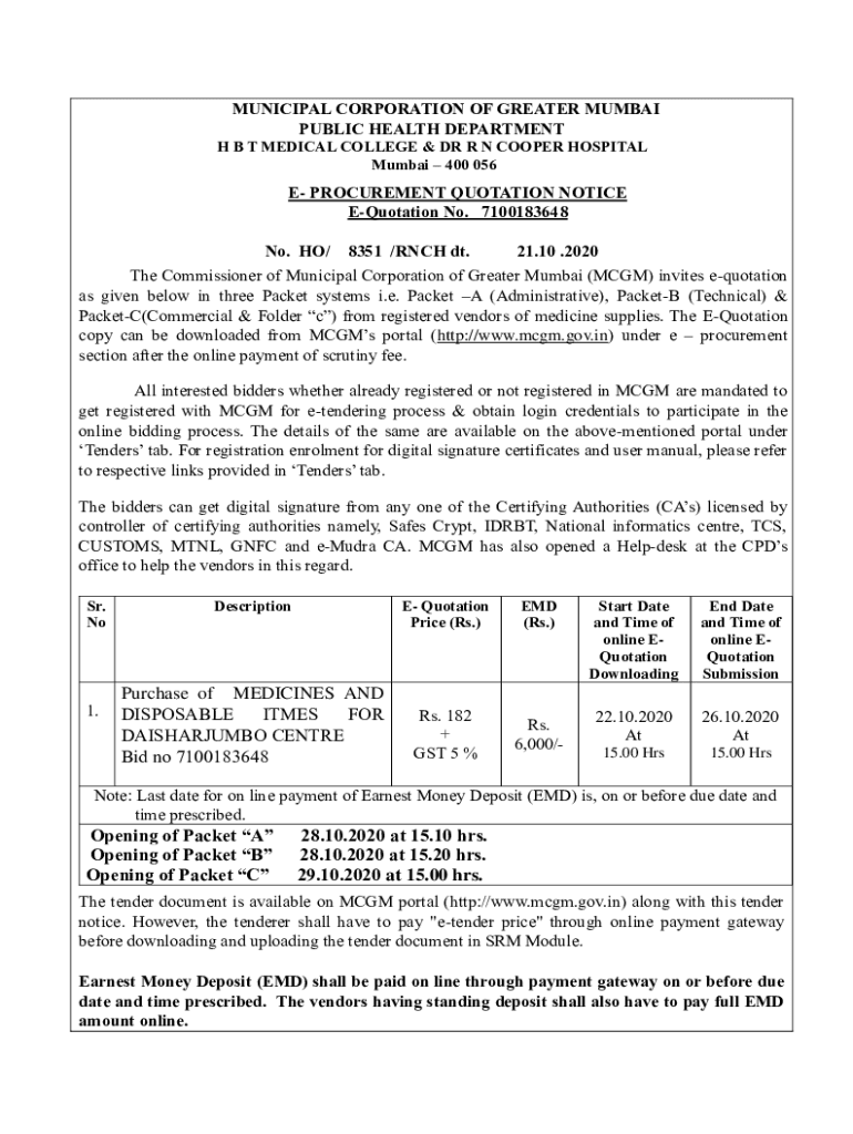 MUNICIPAL CORPORATION OF GREATER MUMBAI PUBLIC HEALTH DEPARTMENT H B T MEDICAL COLLEGE & DR R N COOPER HOSPITAL Mumbai 400 056E PROCUREMENT QUOTATION NOTICE Quotation No. 7100183648 No. HO/8351 /RICH