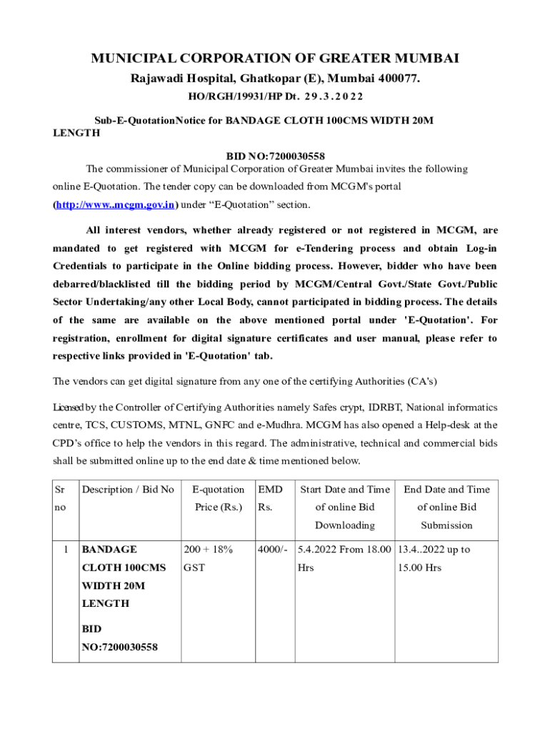MUNICIPAL CORPORATION OF GREATER MUMBAI ATAWAD Hospital, Ghatkopar (E), Mumbai 400077. HO/GH/19931/HP DT. 2 9. 3. 2 0 2 2 SubEQuotationNotice for BANDAGE CLOTH 100CMS WIDTH 20M LENGTH BID NO:7200030558