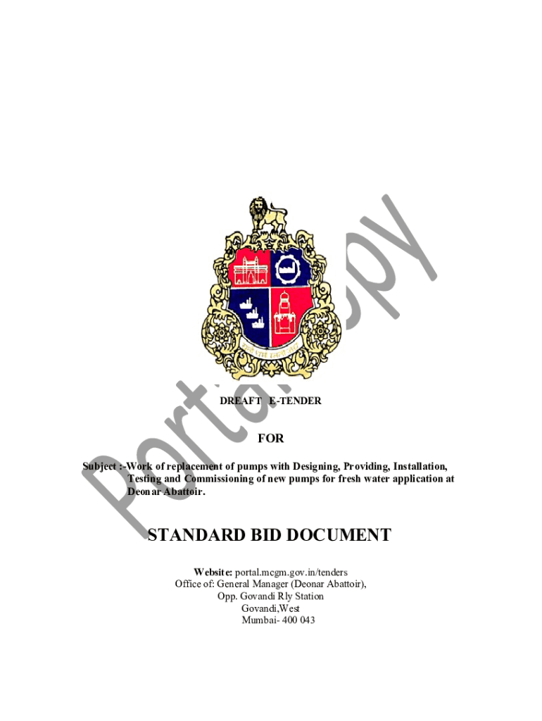 DRAFT TENDERER Subject :Work of replacement of pumps with Designing, Providing, Installation, Testing and Commissioning of new pumps for fresh water application at Leonard Abattoir. STANDARD BID DOCUMENT