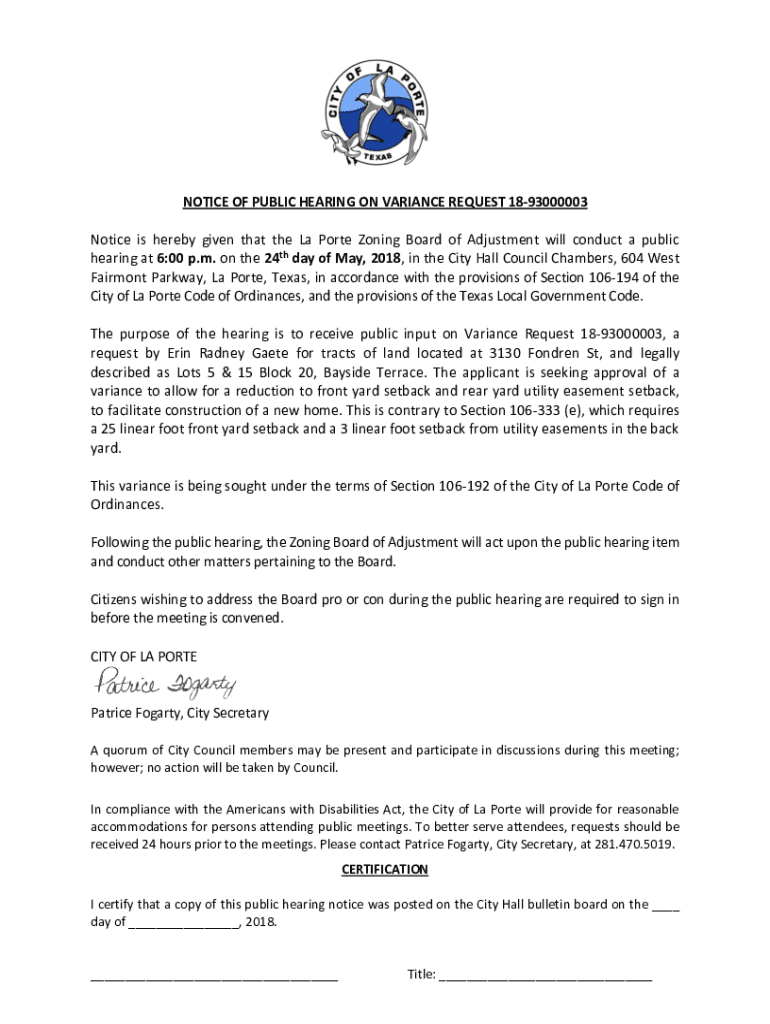 NOTICE OF PUBLIC HEARING ON VARIANCE REQUEST 1893000003 Notice is hereby given that the La Port Zoning Board of Adjustment will conduct a public hearing at 6:00 p.m. on the 24th day of May 2018, in