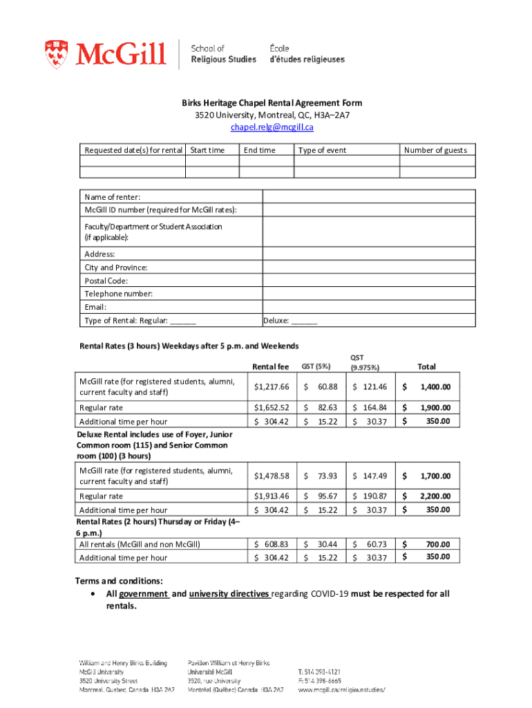Birds Heritage Chapel Rental Agreement Form 3520 University, Montreal, QC, H3A2A7 chapel.relg@mcgill.ca Requested date(s) for rental Start timed teletype of eventNumber of guestsName of renter: McGill