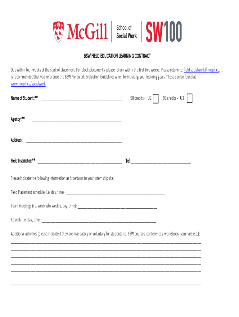 BSW FIELD EDUCATION LEARNING CONTRACT Due within four weeks of the start of placement. For block placements, please return within the first two weeks. Please return to: field.socialwork@mcgill.ca.