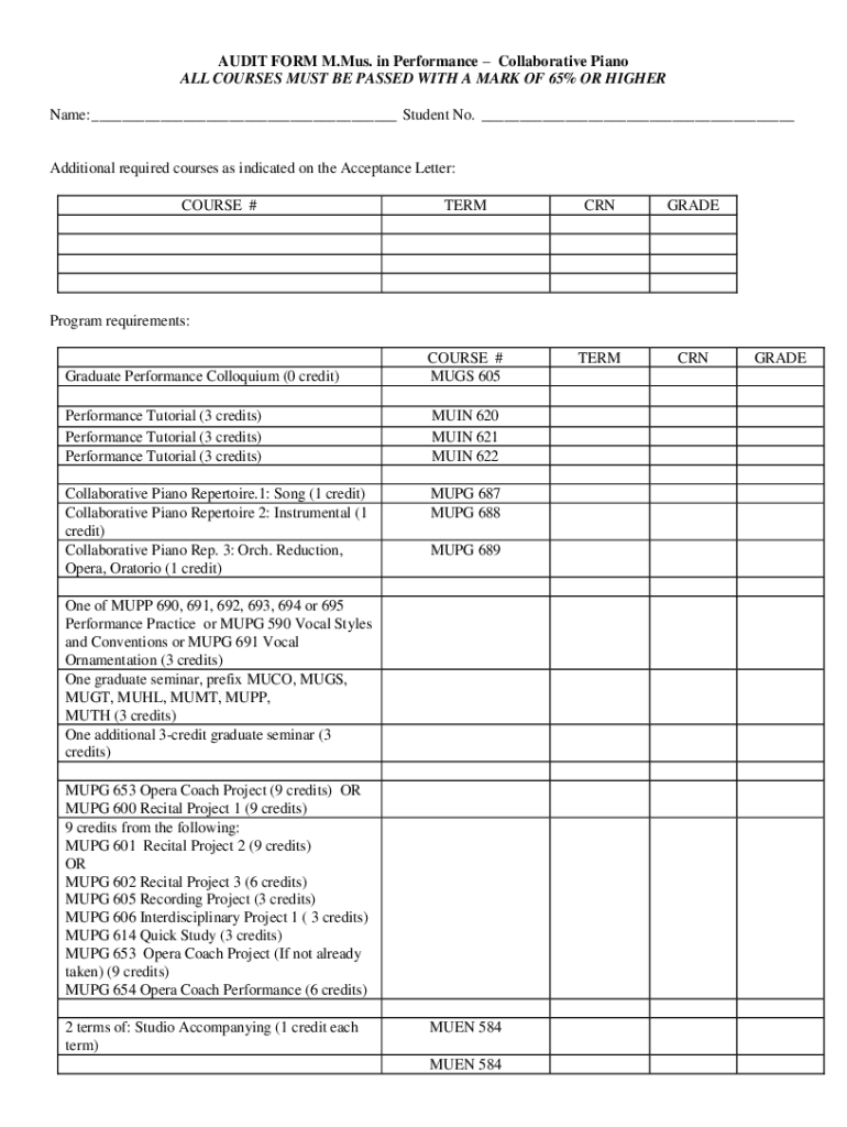 Get the free AUDIT FORM M.Mus. in PerformanceCollaborative Piano