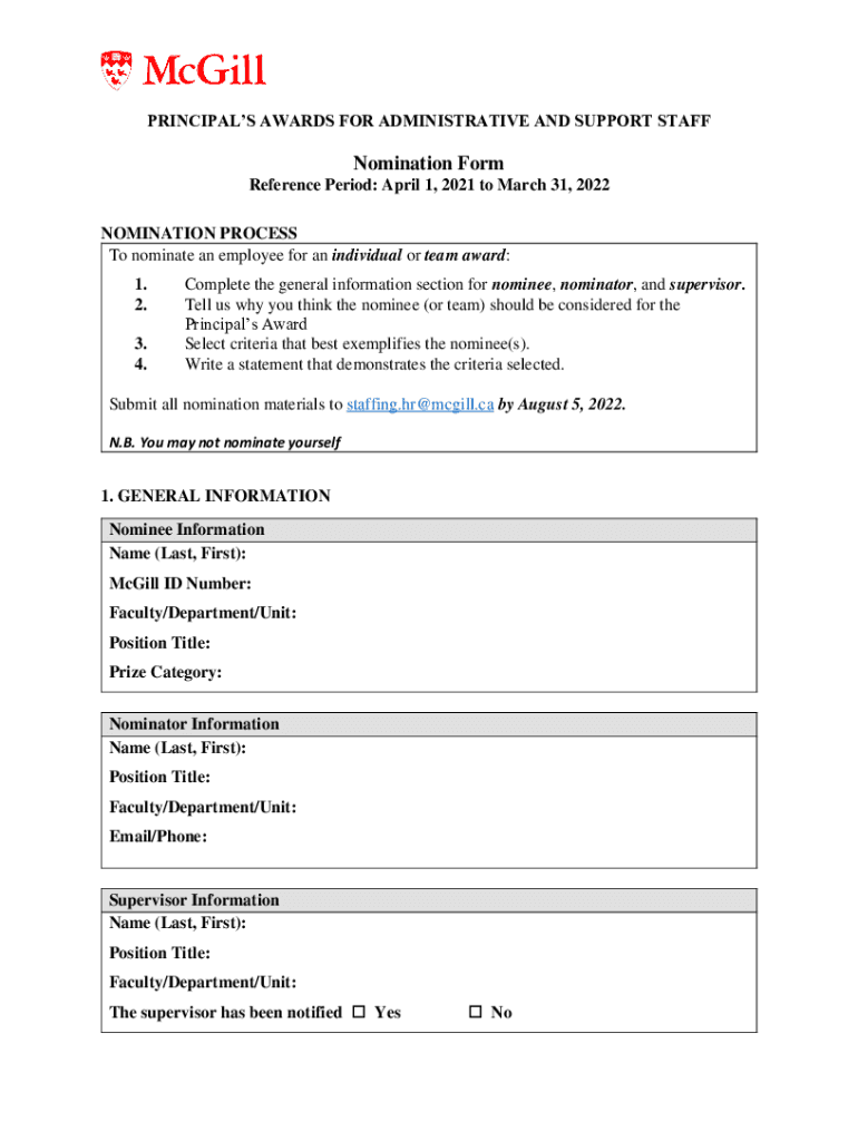 PRINCIPALS AWARDS FOR ADMINISTRATIVE AND SUPPORT STAFFNomination Form Reference Period: April 1, 2021, to March 31, 2022, NOMINATION PROCESS To nominate an employee for an individual or team award: