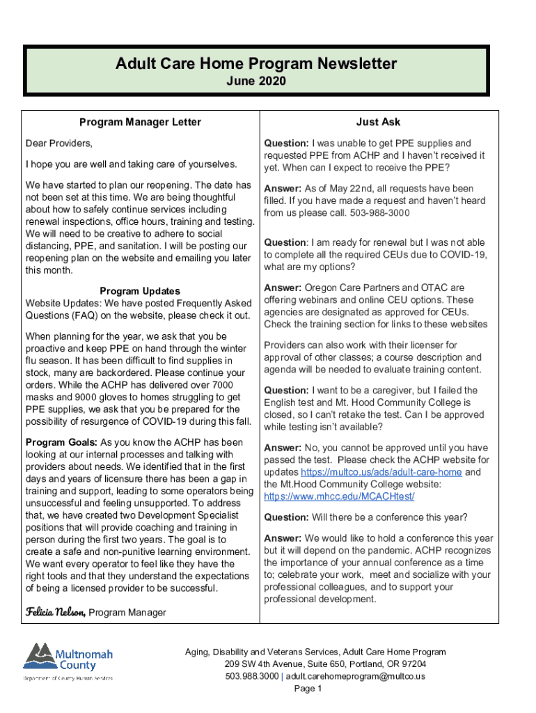 Adult Care Home Program Newsletter June 2020 Program Manager Letter Dear Providers, I hope you are well and taking care of yourselves. Just Ask Question: I was unable to get PPE supplies and requested