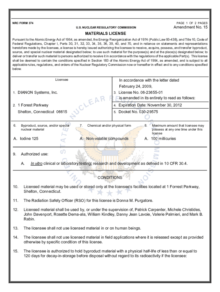 PAGE 1 OF 2 PAGES NRC FORM 374Amendment No. 15U. S. NUCLEAR REGULATORY COMMISSIONMATERIALS LICENSE Pursuant to the Atomic Energy Act of 1954, as amended, the Energy Reorganization Act of 1974 (Public