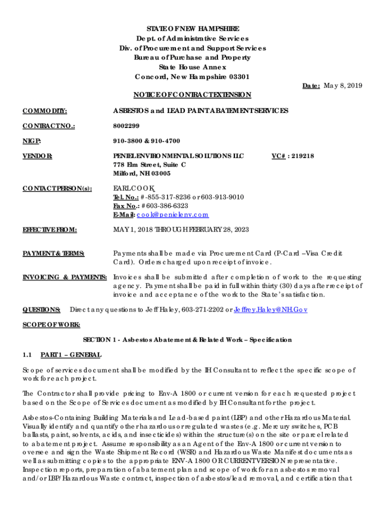 STATE OF NEW HAMPSHIRE Dept. of Administrative Services Div. Of Procurement and Support Services Bureau of Purchase and Property State House Annex Concord, New Hampshire 03301Date: May 8, 2019NOTICE