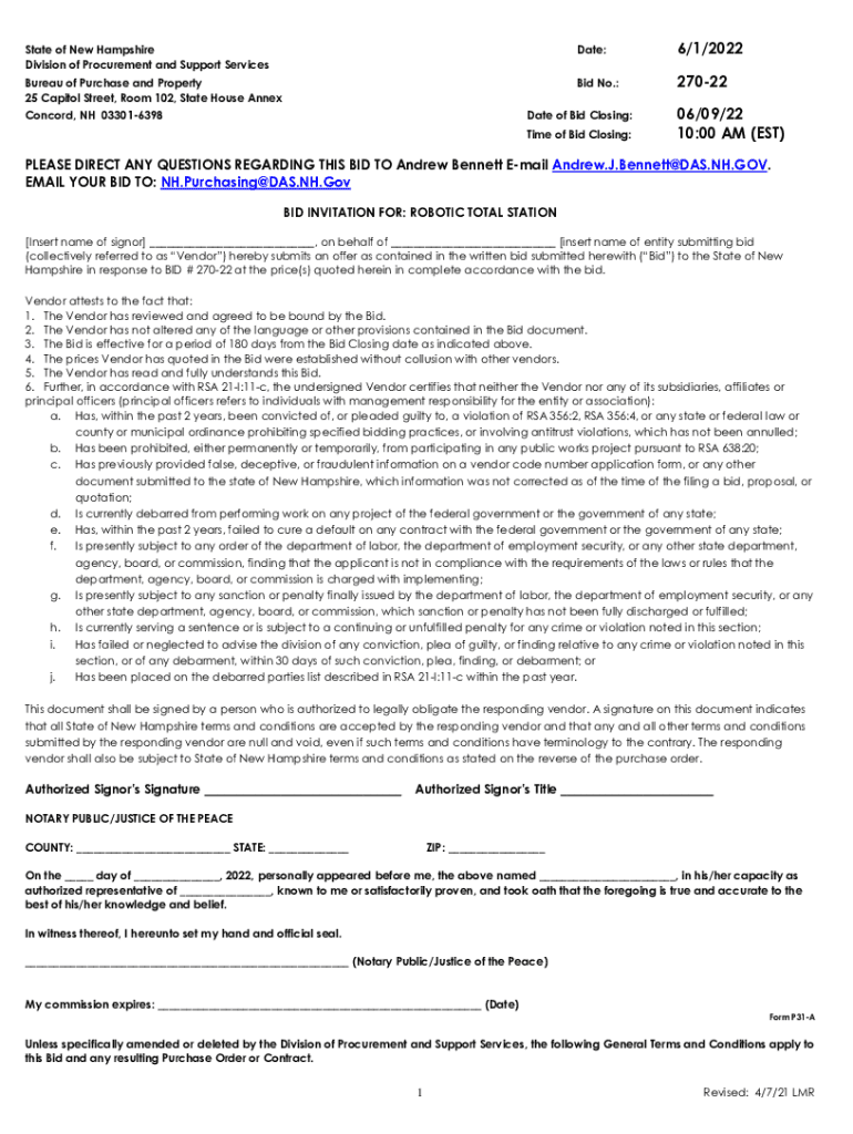 State of New Hampshire Division of Procurement and Support ServicesDate:6/1/2022Bureau of Purchase and Property 25 Capitol Street, Room 102, State House Annexed No.:27022Concord, NH 033016398Date
