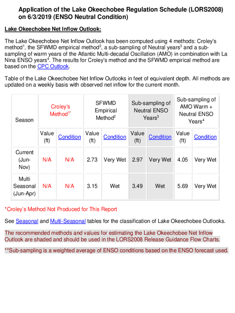 Application of the Lake Okeechobee Regulation Schedule (LORS2008) on 6/3/2019 (ENSO Neutral Condition) Lake Okeechobee Net Inflow Outlook: The Lake Okeechobee Net Inflow Outlook has been computed