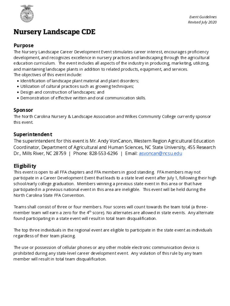 Event Guidelines Revised July 2020Nursery Landscape CDE Purpose The Nursery Landscape Career Development Event stimulates career interest, encourages proficiency development, and recognizes excellence