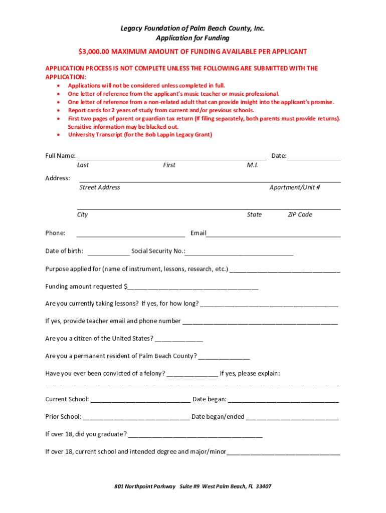 Legacy Foundation of Palm Beach County, Inc. Application for Funding $3,000.00 MAXIMUM AMOUNT OF FUNDING AVAILABLE PER APPLICANT APPLICATION PROCESS IS NOT COMPLETE UNLESS THE FOLLOWING ARE SUBMITTED