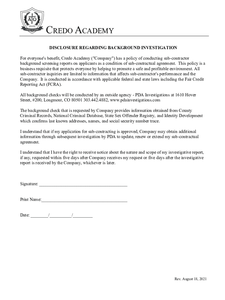 CREDO ACADEMY DISCLOSURE REGARDING BACKGROUND INVESTIGATION For everyone\'s benefit, Credo Academy (\” Company\”) has a policy of conducting subcontractor background screening reports on applicants
