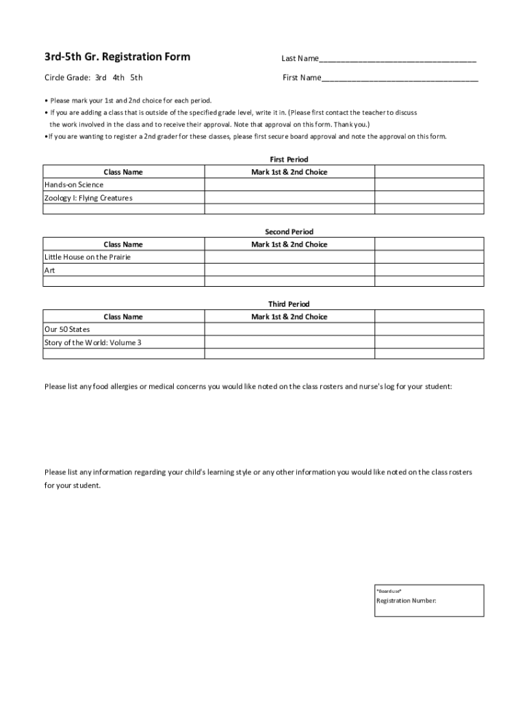 3rd5th Gr. Registration Format Name___ Last Name___Circle Grade: 3rd 4th 5thFirst First Name___ Name___ Please mark your 1st and 2nd choice for each period. If you are adding a class that is outside