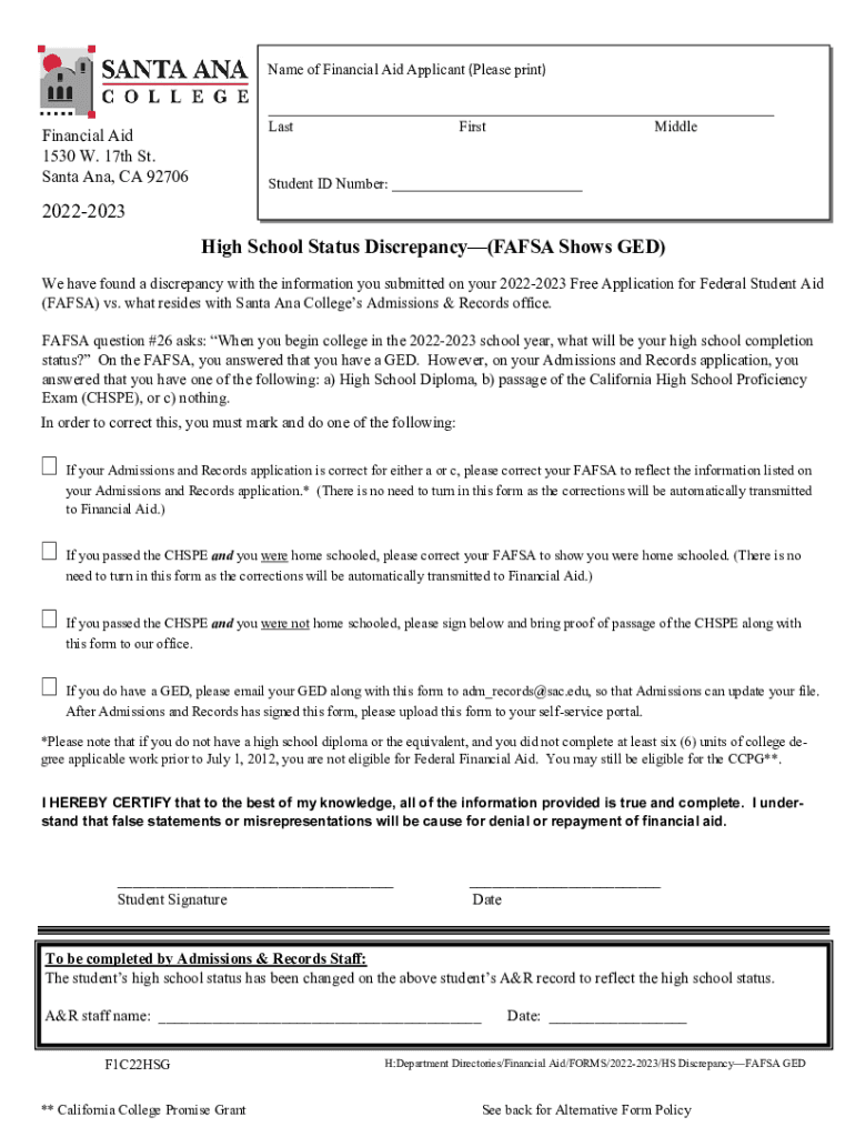 Name of Financial Aid Applicant (Please print) ___ Last First MiddleFinancial Aid 1530 W. 17th St. Santa Ana, CA 92706Student ID Number: ___20222023 High School Status Discrepancy(FAFSA Shows GED)
