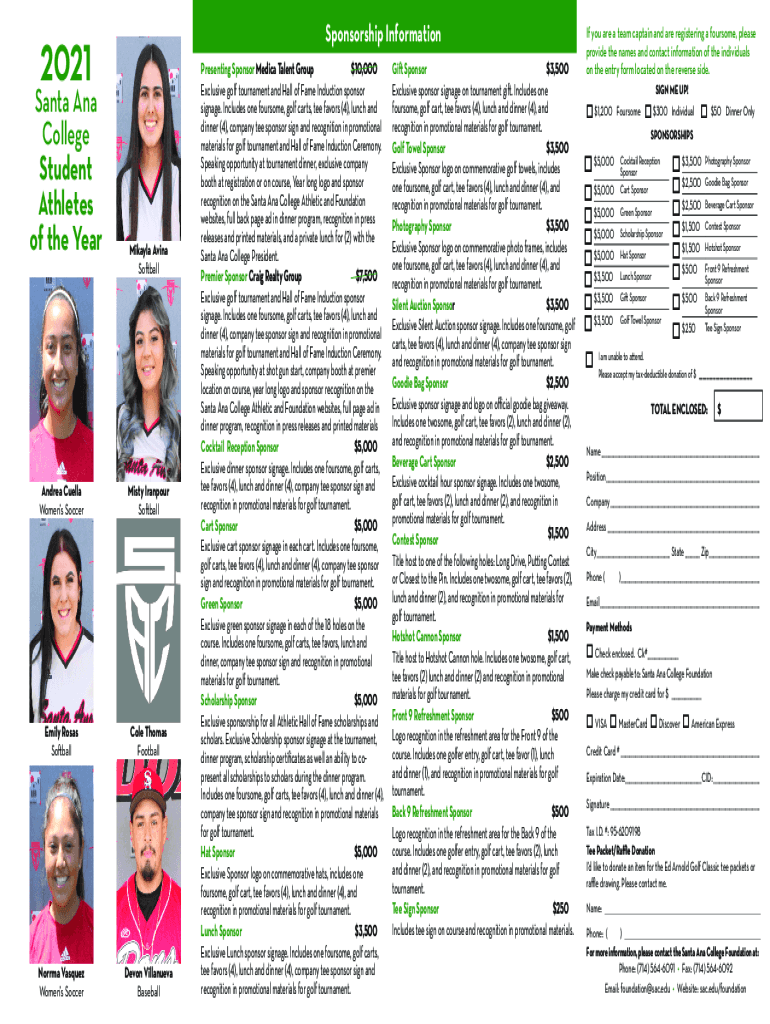 Sponsorship Information2021Santa Ana CollegeStudent Athletes of the Year Andrea Luella Women's Soccer Emily Rosa's SoftballNorrma Vasquez Women's SoccerMikayla Avian Softball Misty Iran pour Softball