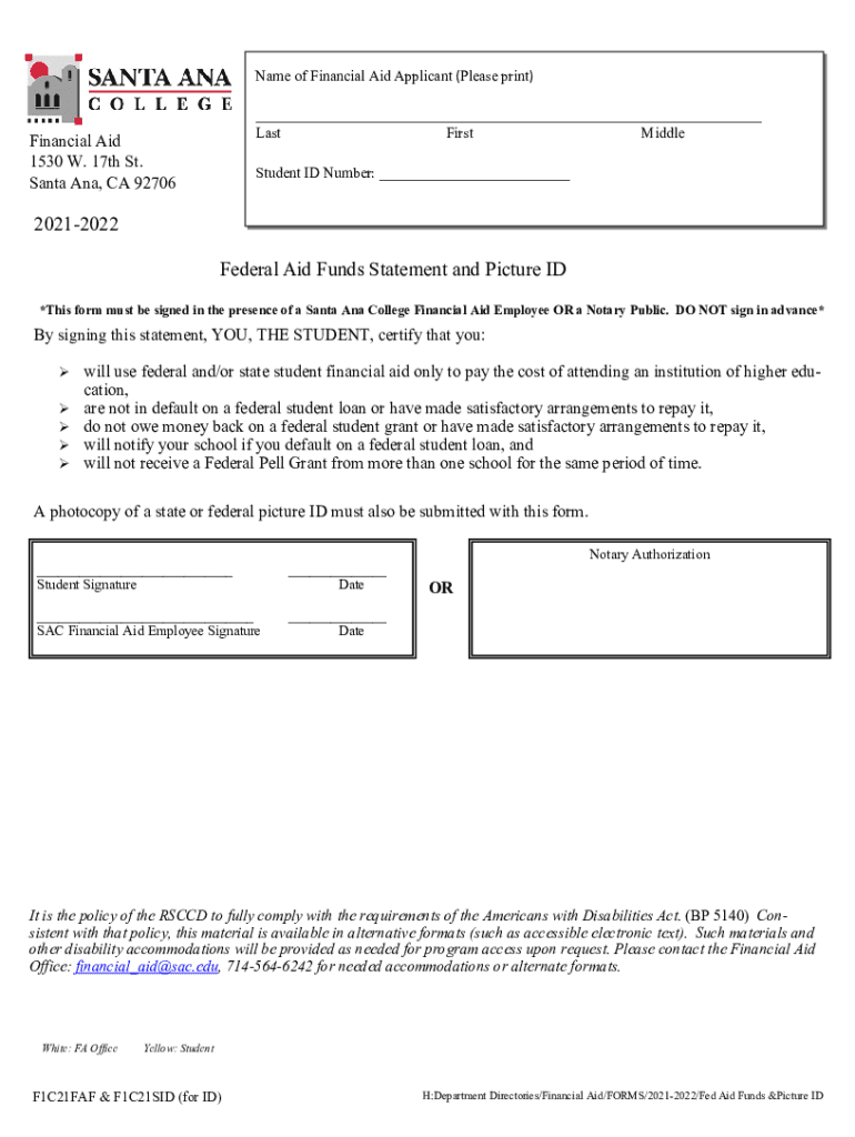 Name of Financial Aid Applicant (Please print) ___ Last First MiddleFinancial Aid 1530 W. 17th St. Santa Ana, CA 92706Student ID Number: ___20212022 Federal Aid Funds Statement and Picture ID *This