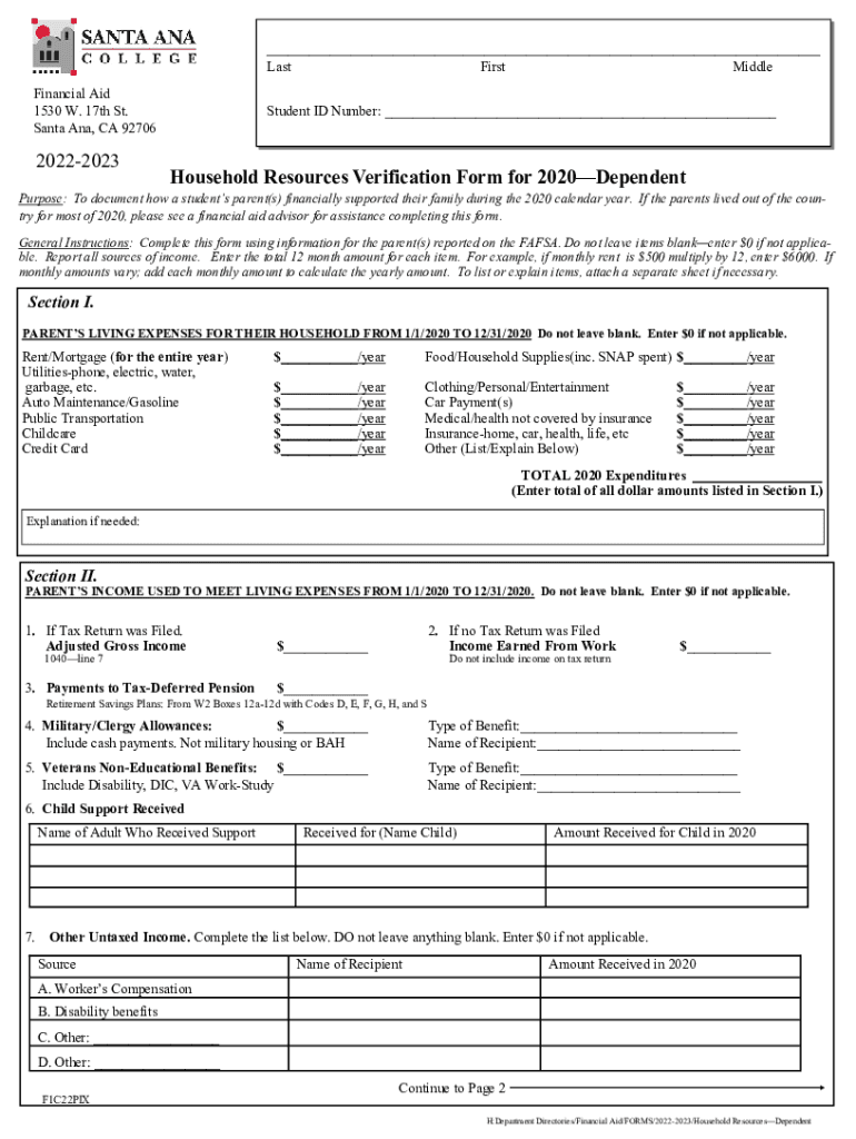1 ___ Last First Middle Financial Aid 1530 W. 17th St. Santa Ana, CA 9270620222023Student ID Number: ___Household Resources Verification Form for 2020DependentPurpose: To document how a student parent(s)