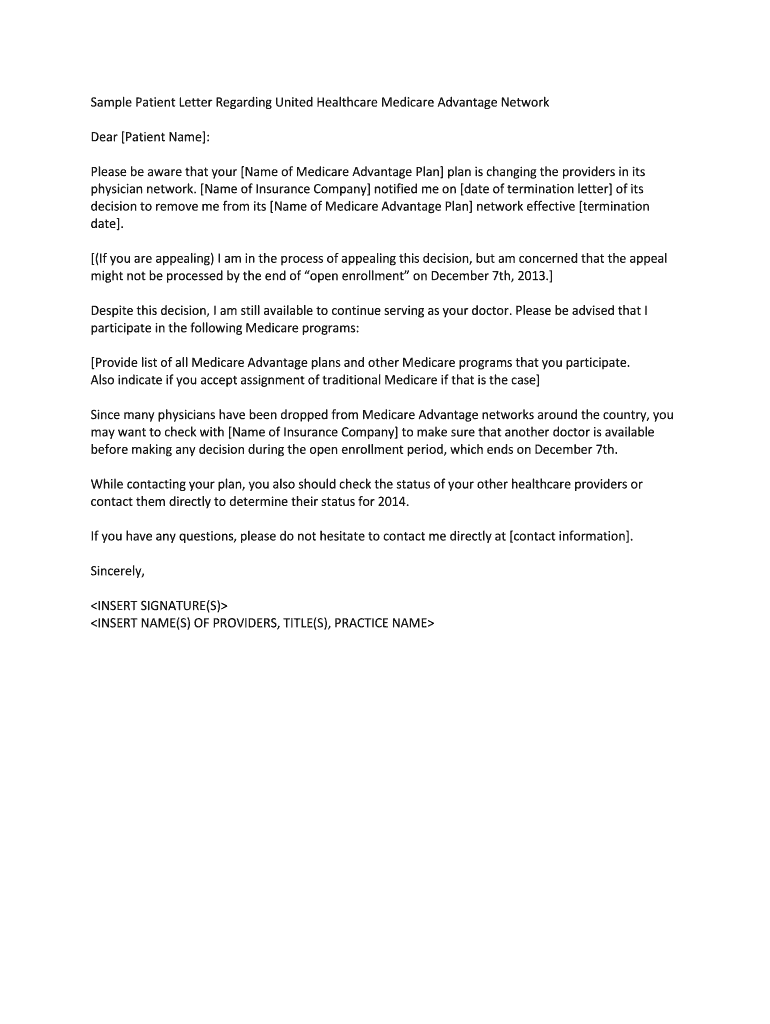 Sample Patient Letter Regarding United Healthcare Medicare Advantage Network Dear Patient Name : Please be aware that your Name of Medicare Advantage Plan is changing the providers in its physician