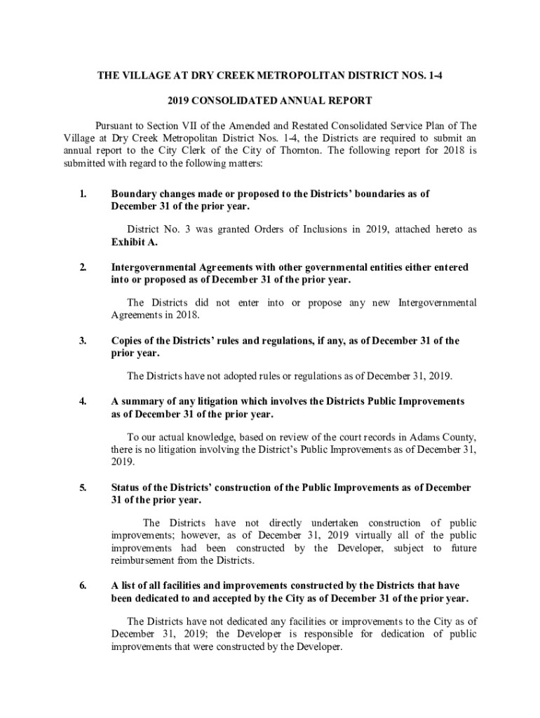 THE VILLAGE AT DRY CREEK METROPOLITAN DISTRICT NOS. 14 2019 CONSOLIDATED ANNUAL REPORT Pursuant to Section VII of the Amended and Restated Consolidated Service Plan of The Village at Dry Creek Metropolitan