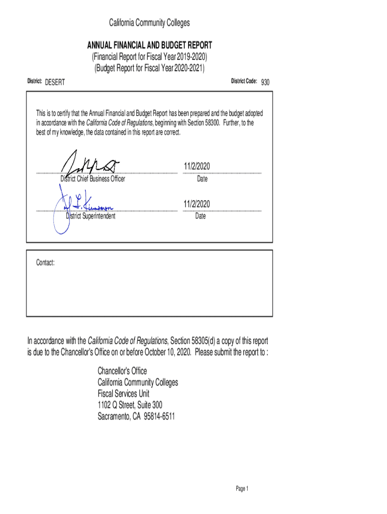 California Community Colleges ANNUAL FINANCIAL AND BUDGET REPORT (Financial Report for Fiscal Year 20192020) (Budget Report for Fiscal Year 20202021) District:District Code:DESERT930This is to certify