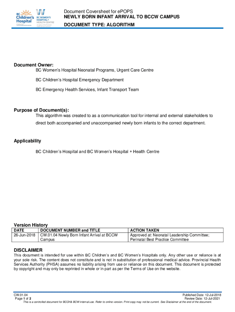 Document Cover sheet for pops NEWLY BORN INFANT ARRIVAL TO BCC CAMPUS DOCUMENT TYPE: ALGORITHMDocument Owner: BC Women's Hospital Neonatal Programs, Urgent Care Center BC Children's Hospital Emergency