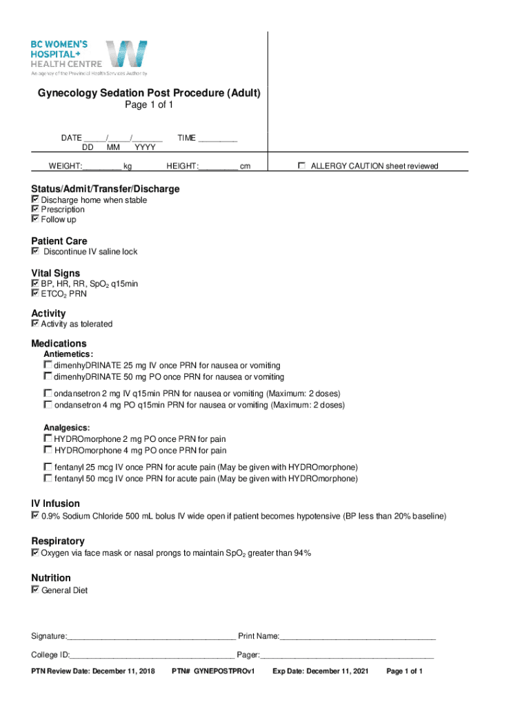 Gynecology Sedation Post Procedure (Adult) Page 1 of 1DATE ___/___/___ DD MM YYY WEIGHT:___ kg TIME ___ALLERGY CAUTION sheet reviewedHEIGHT:___ status/Admit/Transfer/Discharge home when stable Prescription