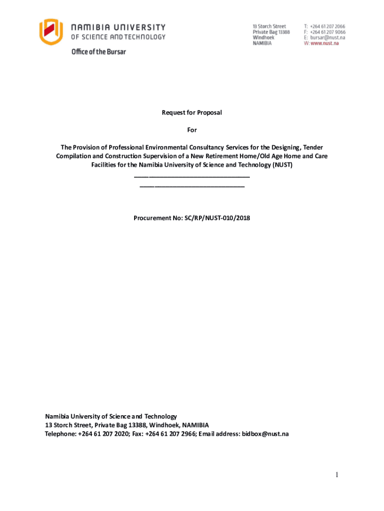 Request for Proposal For The Provision of Professional Environmental Consultancy Services for the Designing, Tender Compilation and Construction Supervision of a New Retirement Home/Old Age Home and