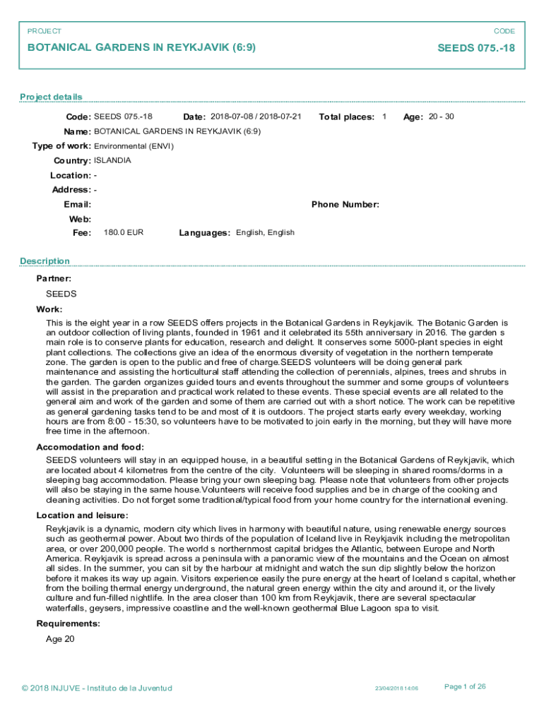 PROJECTCODEBOTANICAL GARDENS IN Reykjavík (6:9)SEEDS 075.18Project details Code: SEEDS 075.18Date: 20180708 / 20180721Total places: 1Age: 20 30Name: BOTANICAL GARDENS IN Reykjavík (6:9) Type of