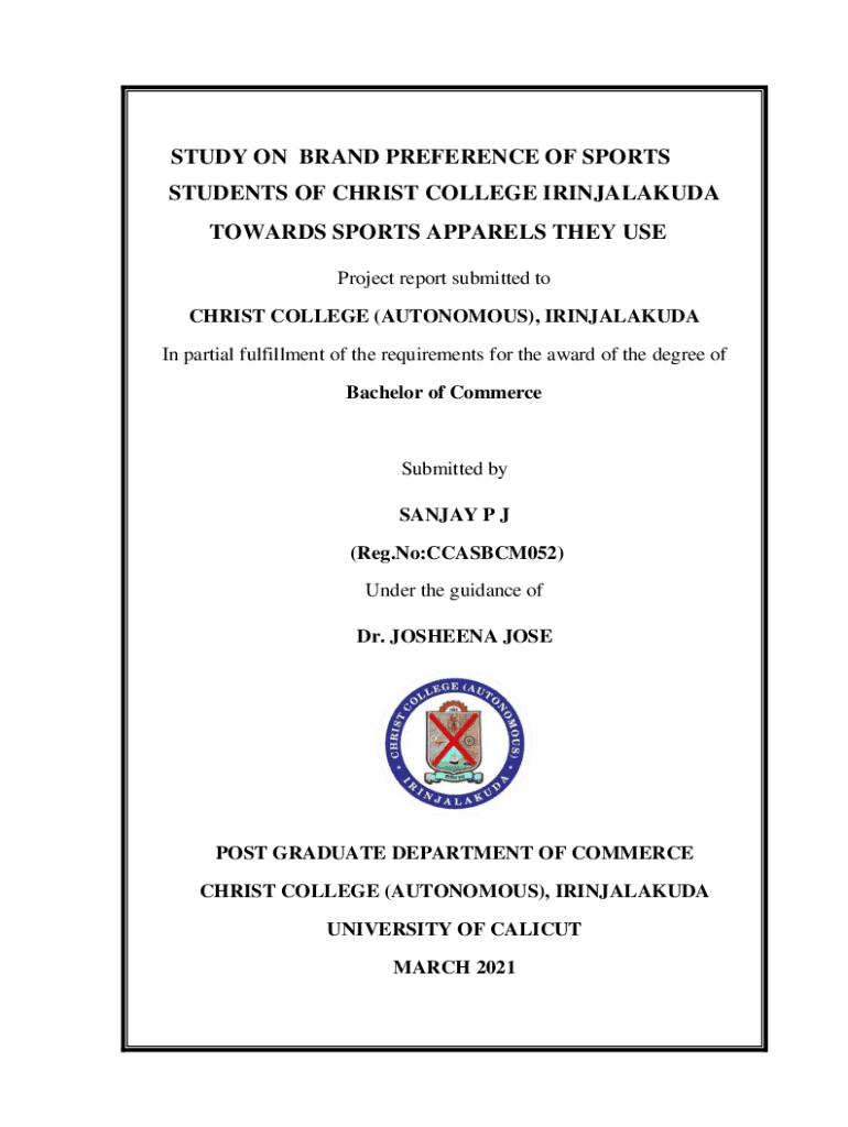 STUDY ON BRAND PREFERENCE OF SPORTS STUDENTS OF CHRIST COLLEGE IRINJALAKUDA TOWARDS SPORTS APPARELS THEY USE Project report submitted to CHRIST COLLEGE (AUTONOMOUS), IRINJALAKUDA In partial fulfillment