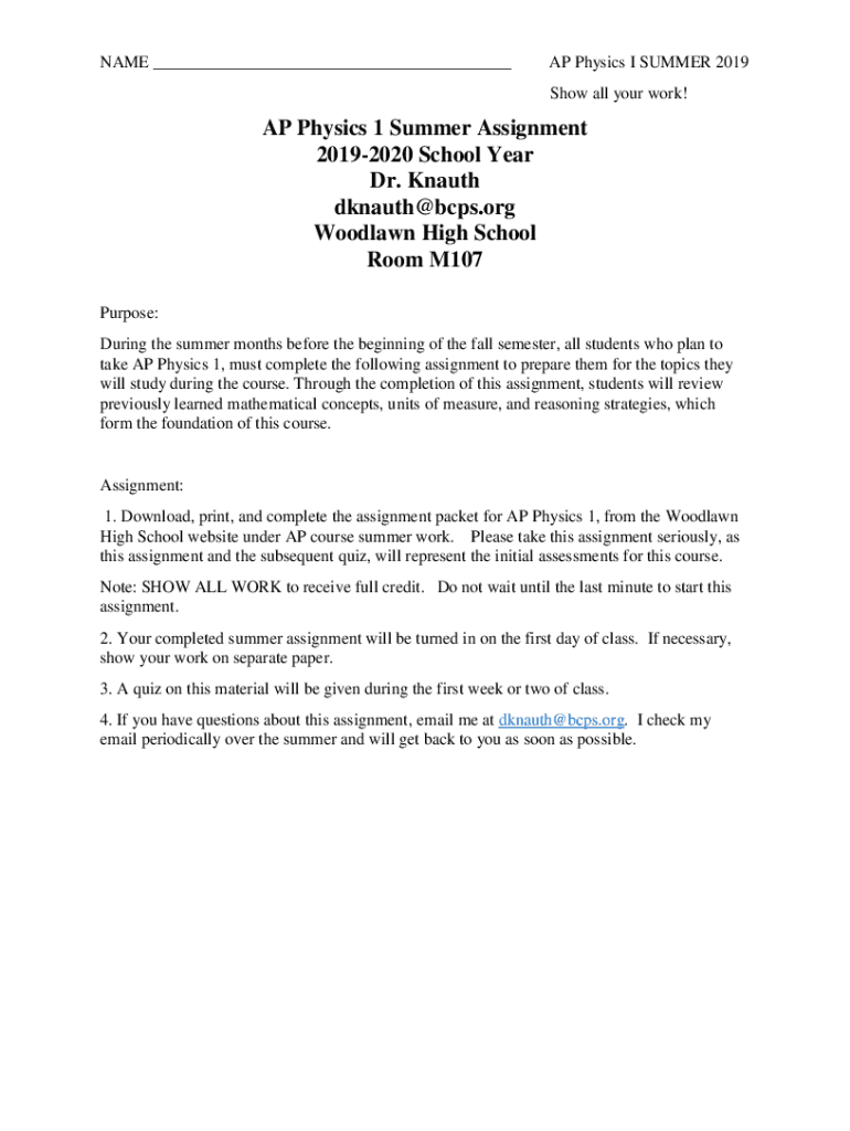 NAME ___AP Physics I SUMMER 2019 Show all your work!AP Physics 1 Summer Assignment 20192020 School Year Dr. Knuth dknauth@bcps.org Woodlawn High School Room M107 Purpose: During the summer months