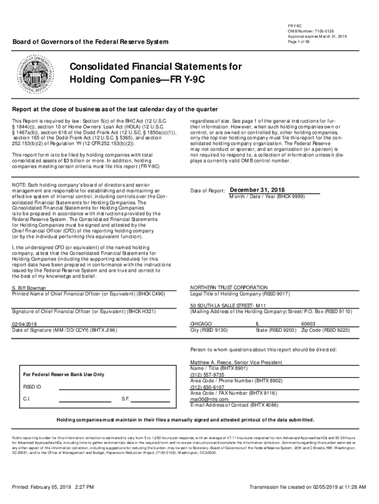 FR Y9C OMB Number: 71000128 Approval expires March 31, 2019-Page 1 of 65Current and Prior Years:Board of Governors of the Federal Reserve Systematical Pages:Consolidated Financial Statements for Holding
