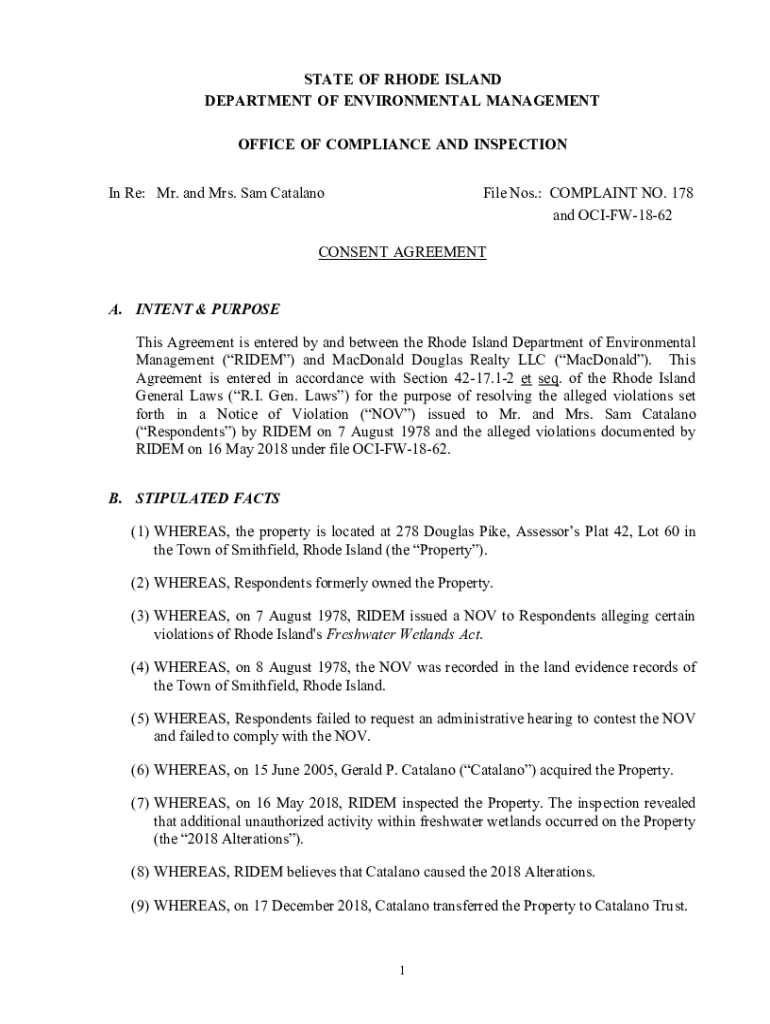 STATE OF RHODE ISLAND DEPARTMENT OF ENVIRONMENTAL MANAGEMENT OFFICE OF COMPLIANCE AND INSPECTION In Re: Mr. and Mrs. Sam CatalanoFile Nos.: COMPLAINT NO. 178 and OCIFW1862CONSENT AGREEMENT. INTENT