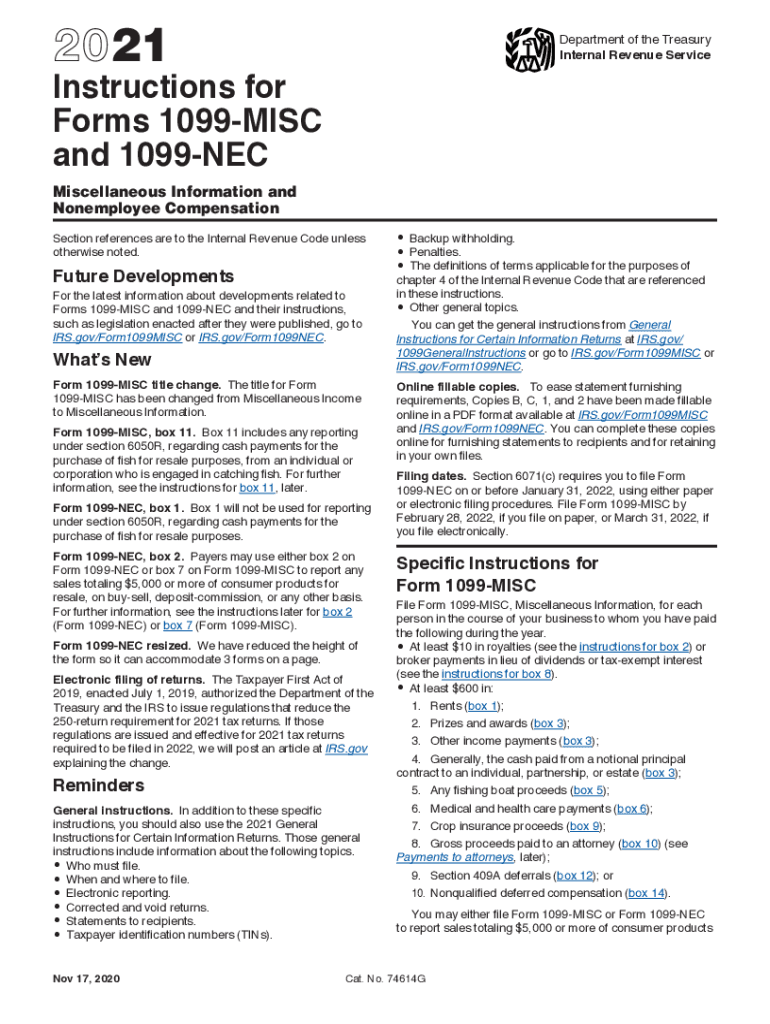 2021Department of the Treasury Internal Revenue ServiceInstructions for Forms 1099MISC and 1099NEC Miscellaneous Information and Nonemployee Compensation Section references are to the Internal Revenue