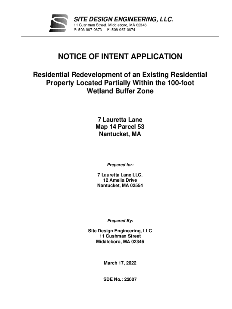NOTICE OF INTENT APPLICATION Residential Redevelopment of an Existing Residential Property Located Partially Within the 100foot Wetland Buffer Zone7 Laurent Lane Map 14 Parcel
