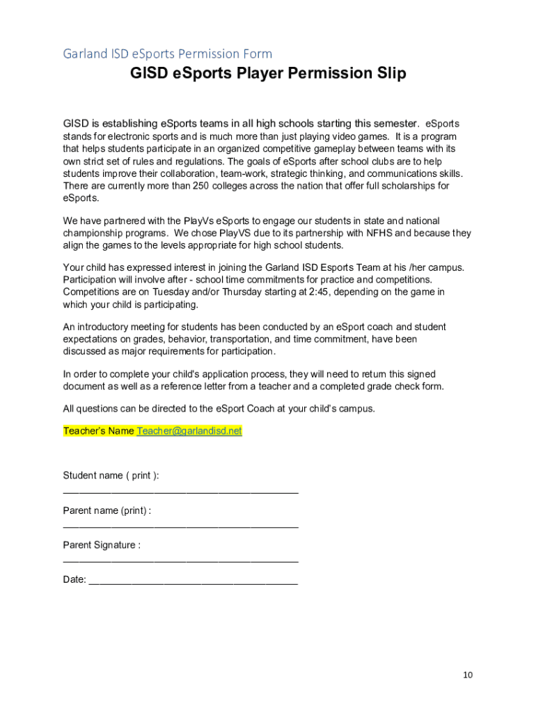 Get the free resources.finalsite.netPermissionSlip1Garland ISD eSports Permission Form GISD eSpor...