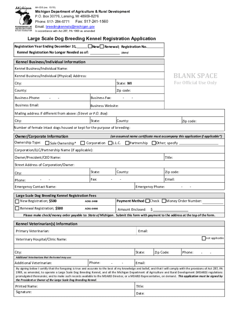AH038 (rev. 10/19)Michigan Department of Agriculture & Rural Development P.O. Box 30776, Lansing, MI 489098276 Phone: 517 2845771 Fax: 5172411560 Email: breedingkennels@michigan.gov In accordance