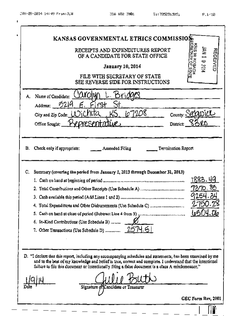 JAN092014 14:49 From:JLW316 682 390110:7852913051P. V10KANSAS GOVERNMENTAL ETHICS COMMISSION’ll;:0;:0mCf) RECBTSANDEXPENDITURESREPORTOF A CANDIDATE FOR STATE OFFICEA00\”\'TlCllJanuary 10,2014cn:t,