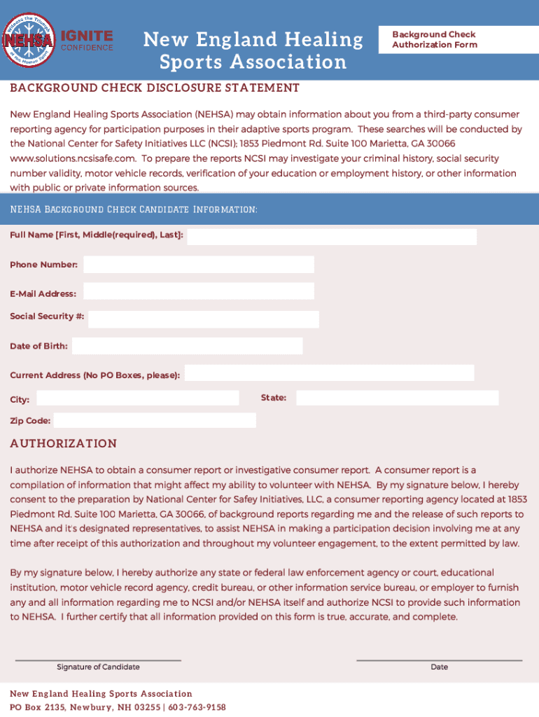 New England Healing Sports AssociationBackground Check Authorization FormBACKGROUND CHECK DISCLOSURE STATEMENT New England Healing Sports Association (NE HSA) may obtain information about you from