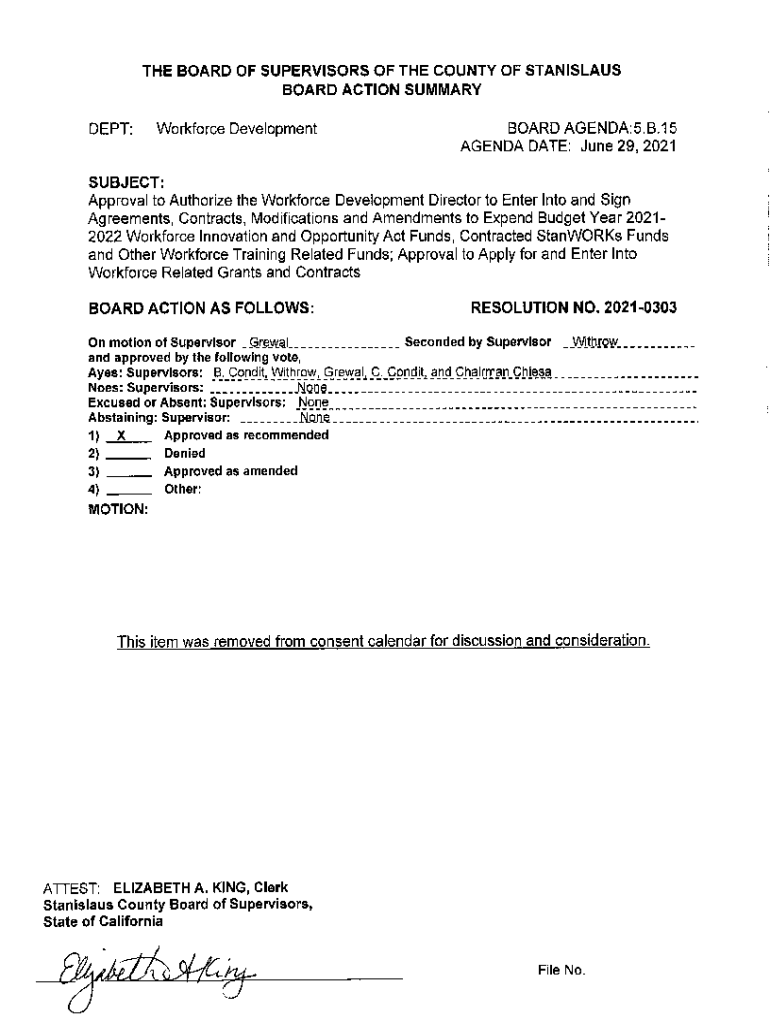 THE BOARD OF SUPERVISORS OF THE COUNTY OF STANISLAUS AGENDA ITEM DEPT:Workforce DevelopmentBOARD AGENDA:5. B.15 AGENDA DATE: June 29, 2021CONSENT: CEO CONCURRENCE: YES4/5 Vote Required: Subject: Approval