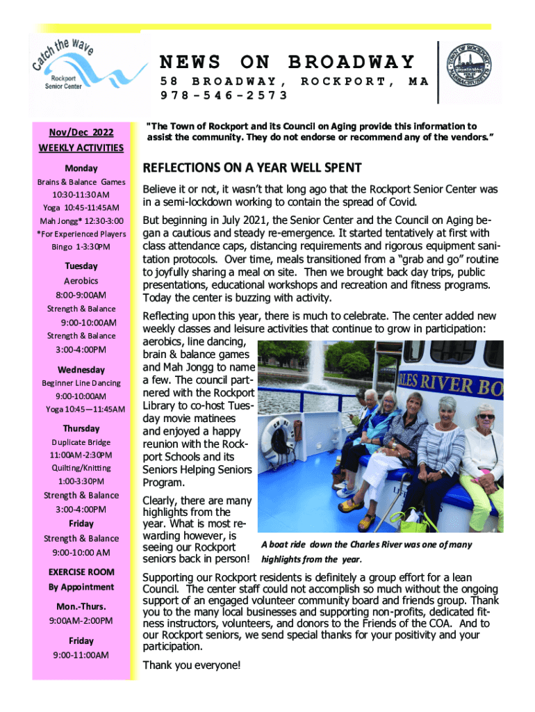 NEWS ON BROADWAY 58 BROADWAY, 9785462573 Nov/Dec 2022 WEEKLY ACTIVITIES Monday Brains & Balance Games 10:3011:30 AM Yoga 10:4511:45AM MAH Long* 12:303:00 *For Experienced Players Bingo 13:30PMTuesday