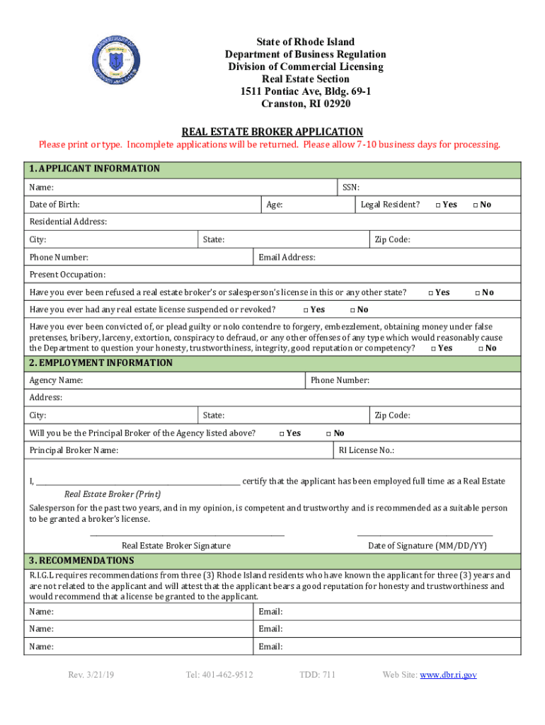 State of Rhode Island Department of Business Regulation Division of Commercial Licensing Real Estate Section 1511 Pontiac Ave, Bldg. 691 Cranston, RI 02920 REQUIREMENTS FOR REAL ESTATE BROKER APPLICANTS
