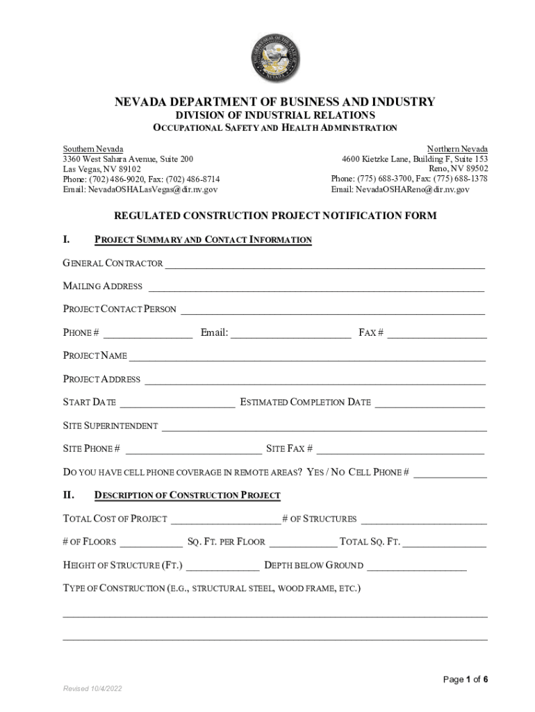 Get the free Nevada OSHA Regulated Construction Project Notification Form