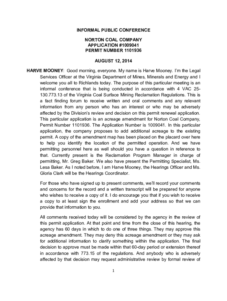 INFORMAL PUBLIC CONFERENCE NORTON COAL COMPANY APPLICATION #1009041 PERMIT NUMBER 1101936 AUGUST 12, 2014, HAVE MOONEY: Good morning, everyone. My name is Have Mooney. I'm the Legal Services Officer