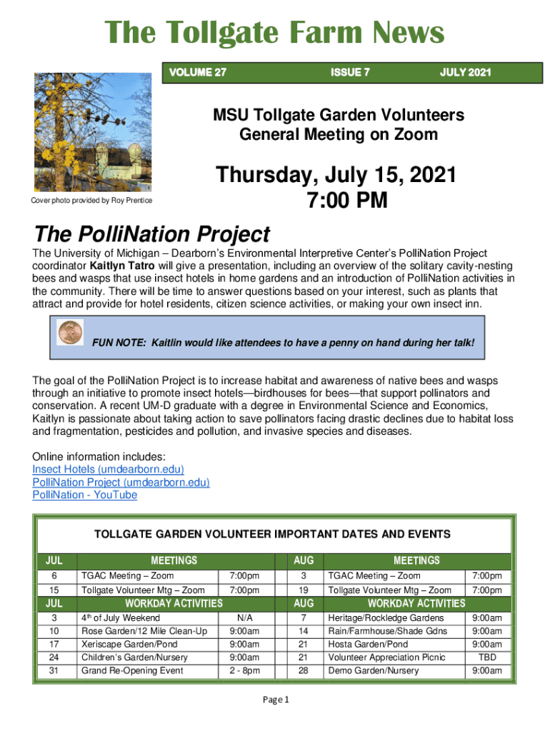 The Tollgate Farm News VOLUME 27ISSUE 7JULY 2021MSU Tollgate Garden Volunteers General Meeting on Softcover photo provided by Roy Prentice Thursday, July 15, 2021 7:00 PMT he Pollination Project The