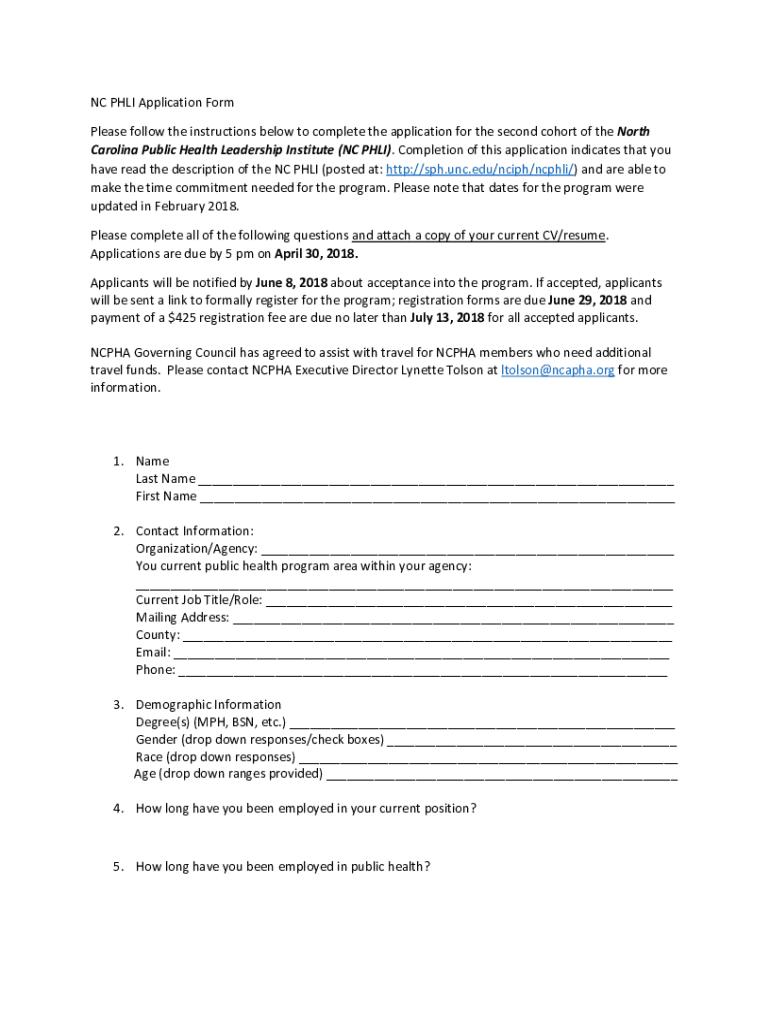 NC PHI Application Form Please follow the instructions below to complete the application for the second cohort of the North Carolina Public Health Leadership Institute (NC PHI). Completion of this