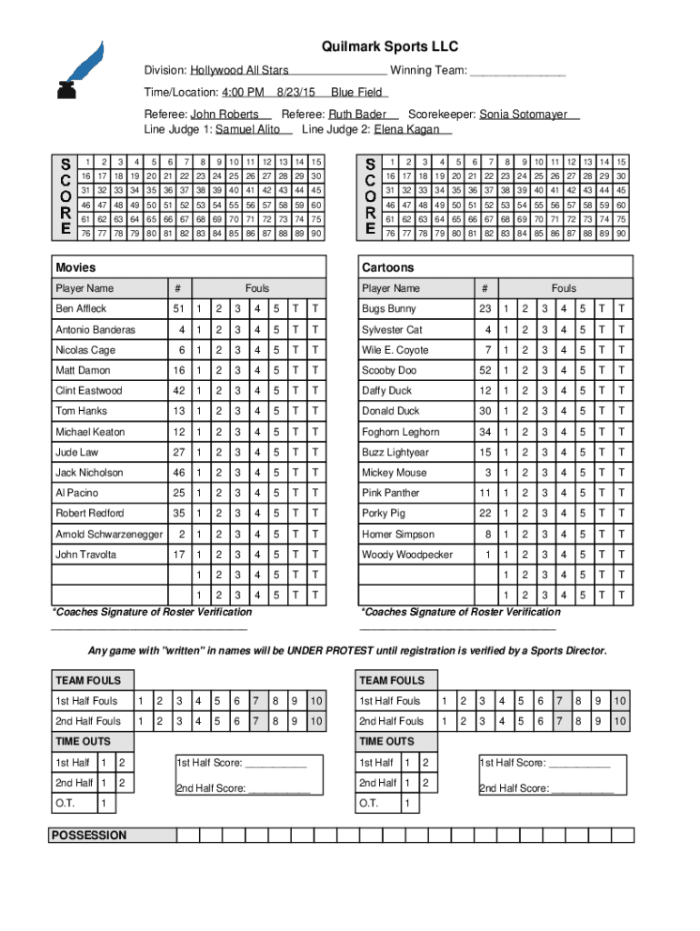 Bookmark Sports LLC Division: Hollywood All Stars Time/Location: 4:00 Winning Team: ___8/23/15Blue FieldReferee: John Roberts Referee: Ruth Baker Scorekeeper: Sonia Sotomayor Line Judge 1: Samuel