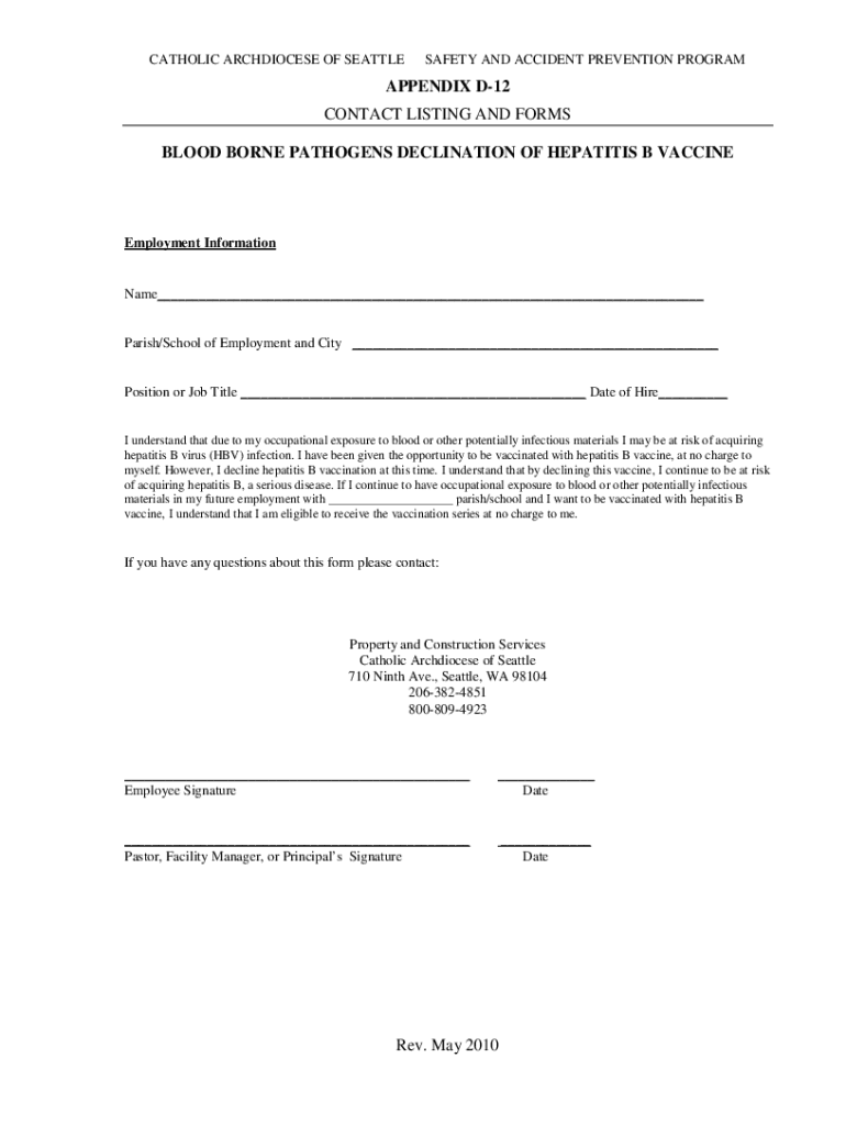CATHOLIC ARCHDIOCESE OF SEATTLESAFETY AND ACCIDENT PREVENTION PROGRAMAPPENDIX D12 CONTACT LISTING AND FORMS Blood-borne PATHOGENS DECLINATION OF HEPATITIS B VACCINEEmployment Informational___Parish/School