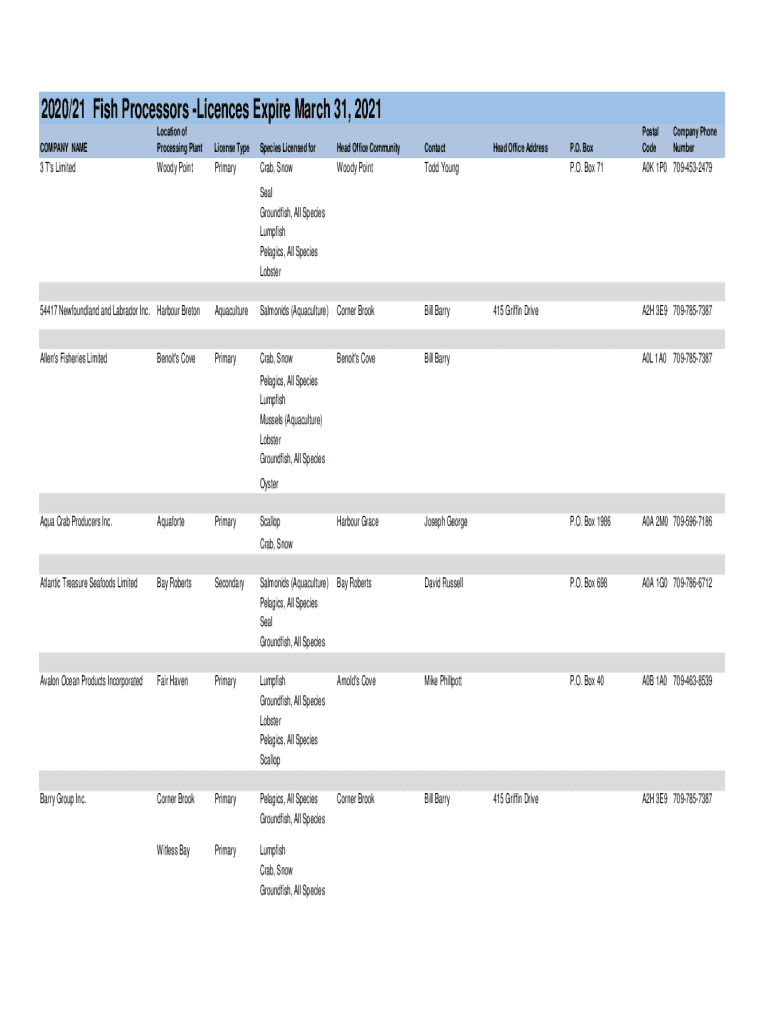 2020/21 Fish Processors Licenses Expire March 31, 2021,