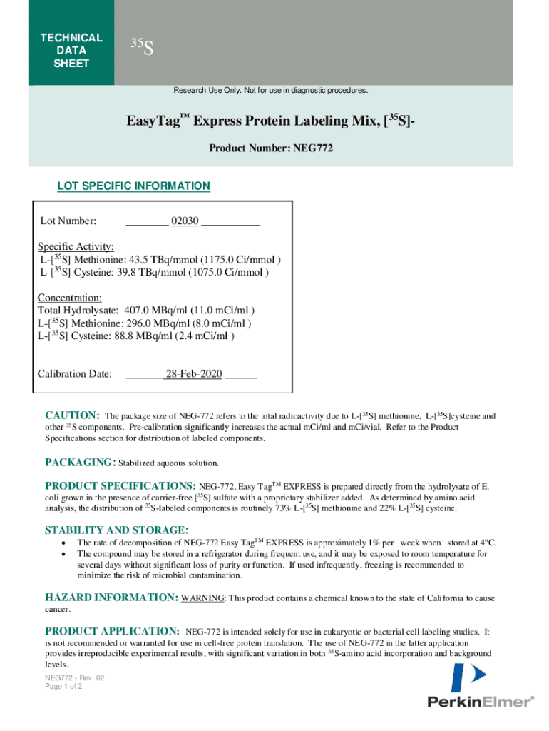 TECHNICAL DATA SHEET35S Research Use Only. Not for use in diagnostic procedures. Maytag Express Protein Labeling Mix, [35S]Product Number: NEG772LOT SPECIFIC INFORMATION Lot Number:___ 02030 ___Specific